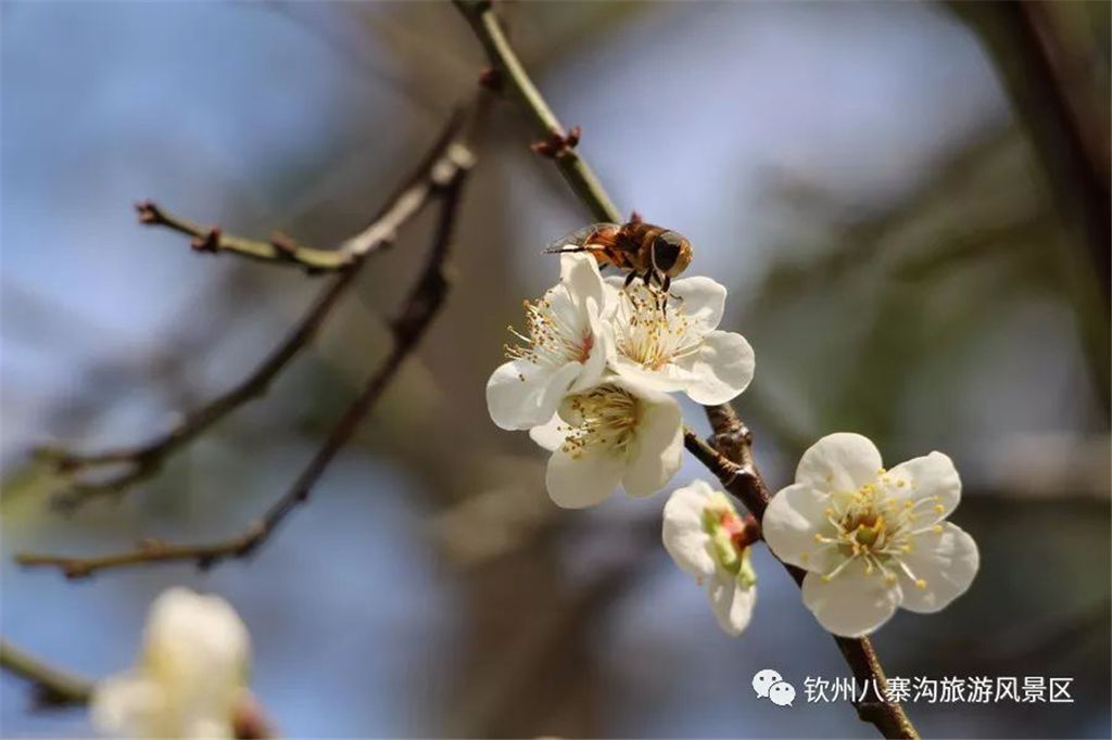 雖說梅花香自苦寒來,但陽光下的梅花更是吸引蝴蝶、蜜蜂的到來。一朵朵白色的小花在藍天和綠色的植物相襯下,相映成趣、美景如畫!