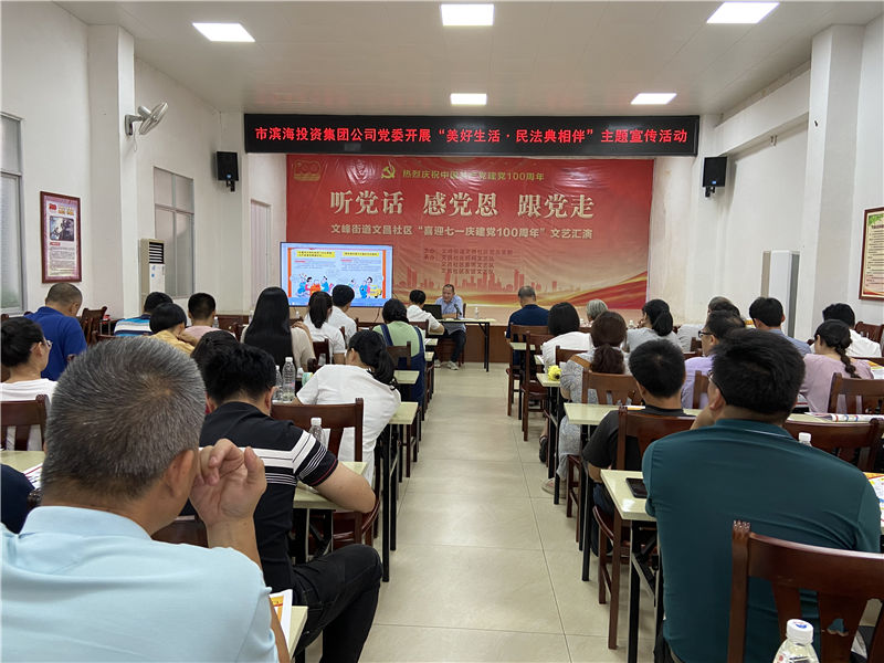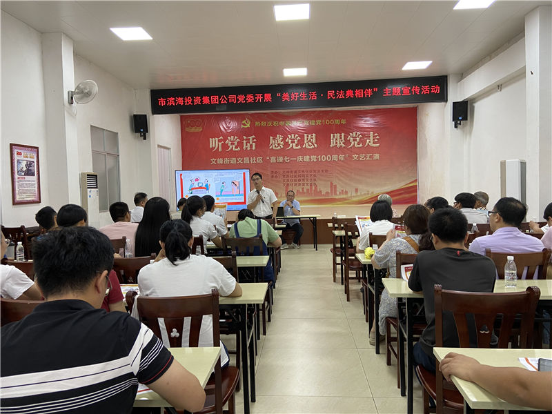 2021年6月28日,集團(tuán)公司黨委組織黨員干部到文昌社區(qū)開展“美好生活·民法典相伴”主題宣傳活動。并在文昌社區(qū)新時代文明實(shí)踐大課堂舉辦了一場《中華人民共和國民法典》宣傳宣講。