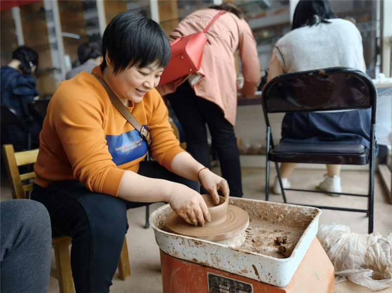 坭興陶文化體驗(yàn)活動(dòng)分為文化知識(shí)講解和制作體驗(yàn)兩部分。文化館負(fù)責(zé)人詳細(xì)講解欽州市泥興陶歷史文化、成就,并帶領(lǐng)女職工們參觀陶器燒制現(xiàn)場(chǎng)和泥興陶成品,介紹泥興陶制作過(guò)程以及煙塵處理等知識(shí)。在陶藝制作體驗(yàn)環(huán)節(jié),女職工們認(rèn)真觀摩陶藝?yán)蠋煹牟僮餮菔纠吆偷窨蹋⒂心S袠拥闹谱?,雖然制作出來(lái)的作品相對(duì)粗糙,但大家如獲至寶。