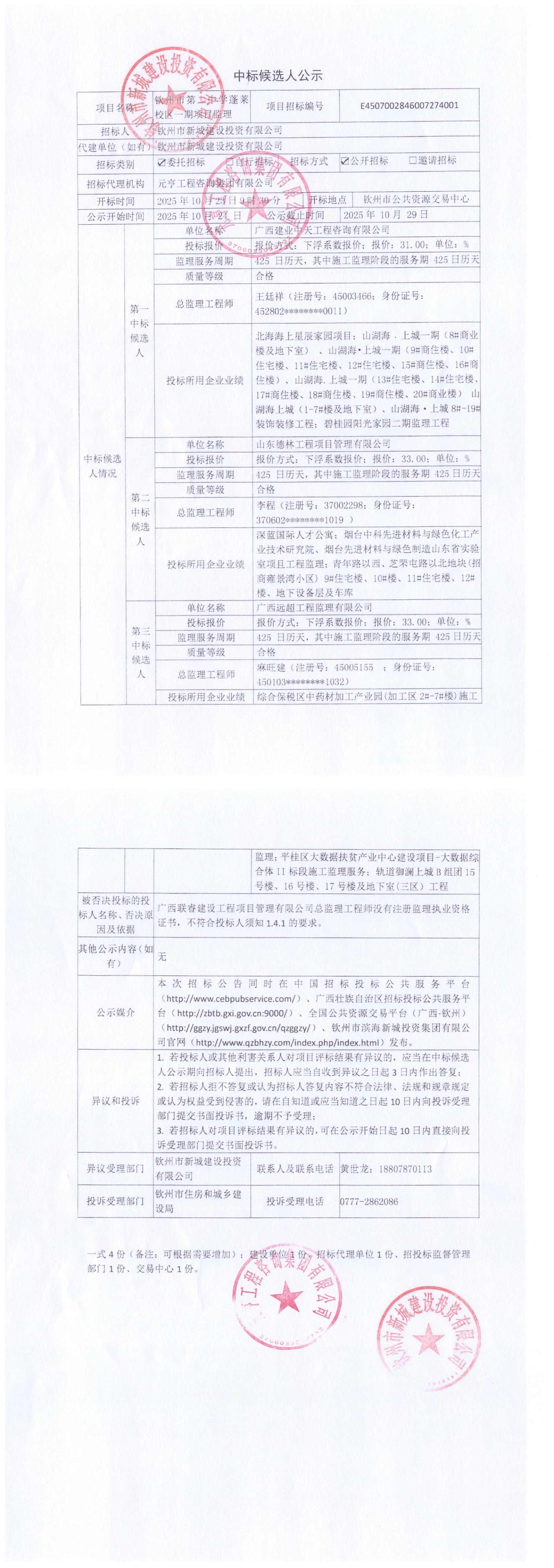 中標(biāo)候選人公示(欽州市第二中學(xué)蓬萊校區(qū)一期項(xiàng)目監(jiān)理)