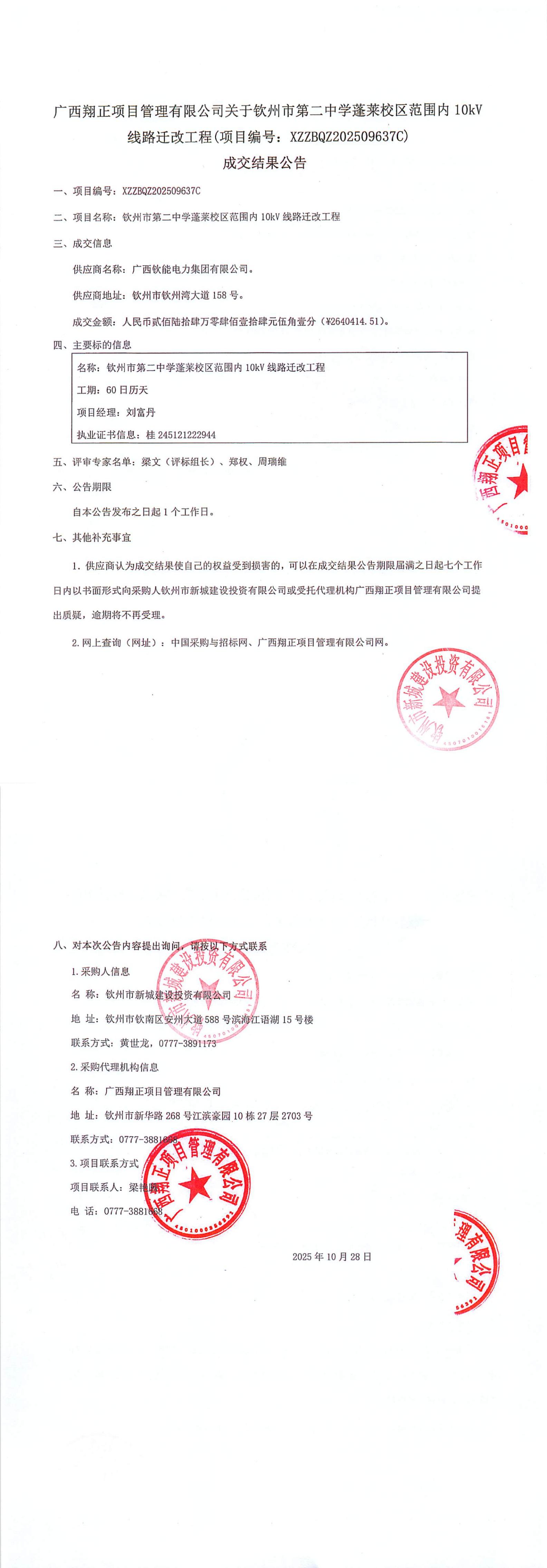 關(guān)于欽州市第二中學(xué)蓬萊校區(qū)范圍內(nèi)10kV線路遷改工程(項(xiàng)目編號(hào):XZZBQZ202509637C)成交結(jié)果公告