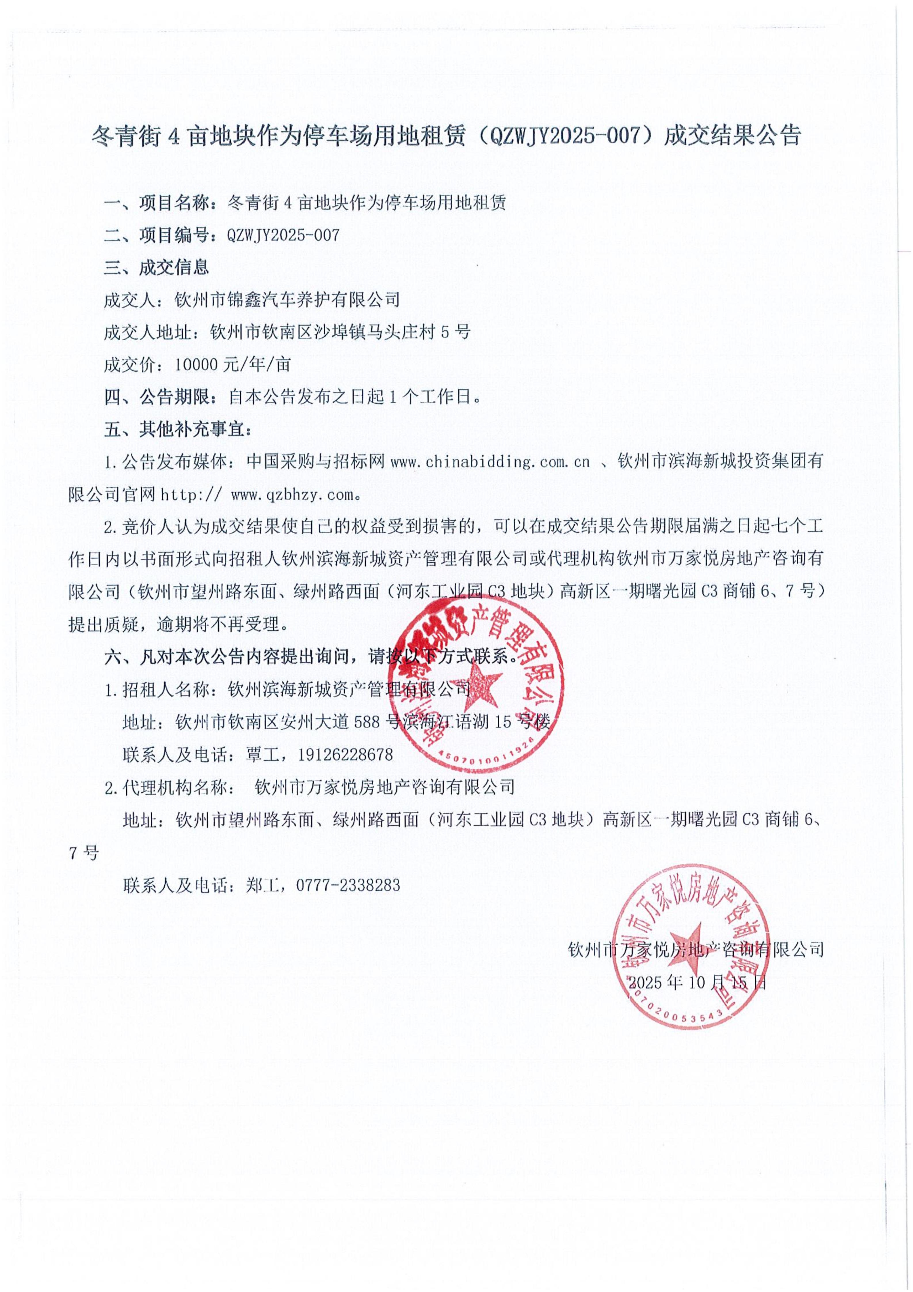 冬青街4畝地塊作為停車場用地租賃(QZWJY2025-007)成交結(jié)果公告