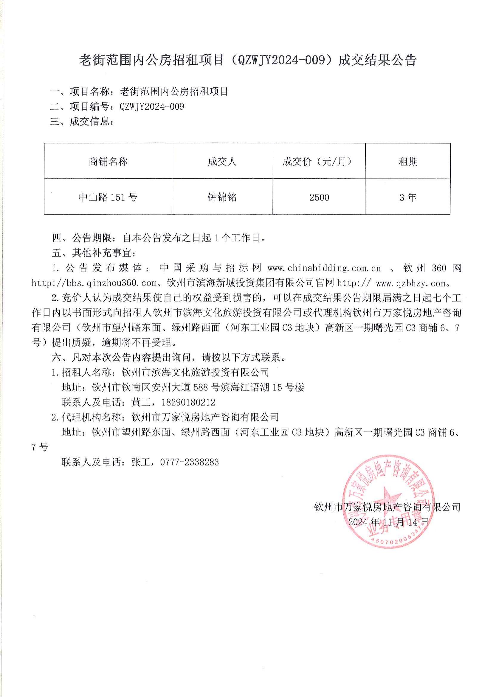 老街范圍內(nèi)公房招租項(xiàng)目(QZWJY2024-009)成交結(jié)果公告