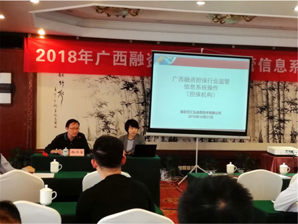 2018年10月31日,由自治區(qū)金融辦組織,在桂林榕湖飯店由系統(tǒng)設(shè)計(jì)方南京萬(wàn)匯弘信息科技有限公司負(fù)責(zé)人陳月對(duì)廣西融資擔(dān)保行業(yè)監(jiān)管信息系統(tǒng)操作進(jìn)行培訓(xùn)。