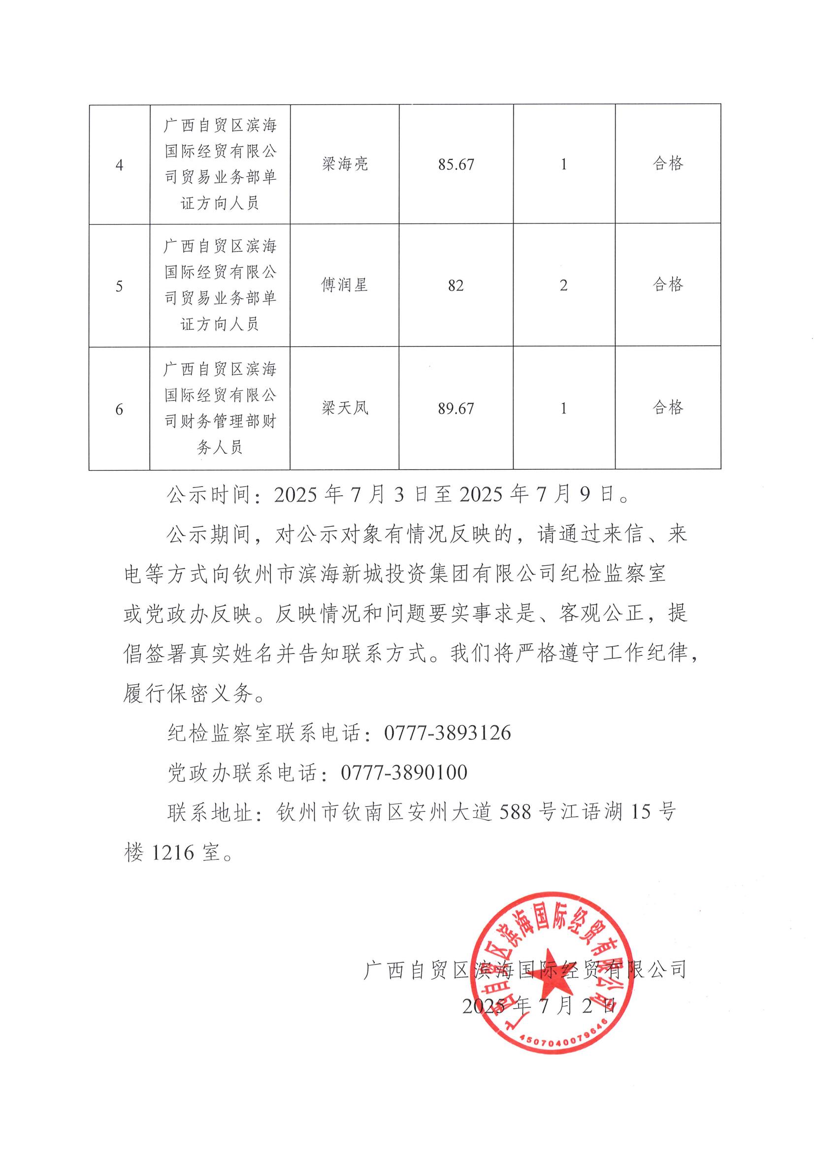 廣西自貿(mào)區(qū)濱海國際經(jīng)貿(mào)有限公司2025年公開招聘工作人員擬聘用人選公示