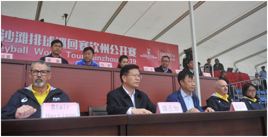 10月31日,2019年世界沙灘排球賽—欽州公開(kāi)賽開(kāi)幕式在比賽現(xiàn)場(chǎng)主賽場(chǎng)舉行,國(guó)際排聯(lián)技術(shù)代表布萊爾•哈里森、國(guó)家體育總局排球運(yùn)動(dòng)管理中心黨委書(shū)記顧國(guó)平講話(huà),譚丕創(chuàng)市長(zhǎng)致辭并宣布2019年世界沙灘排球巡回賽開(kāi)幕。