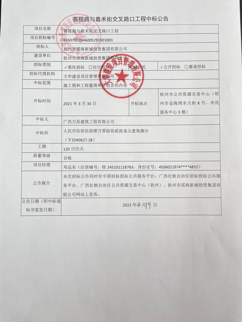 欽州市濱海新城菩提路Ⅱ標段(平山大街—嘉興街)道路工程及地下綜合管廊(菩提路段:平山大街—嘉興街)工程——支架安裝工程成交結果公告