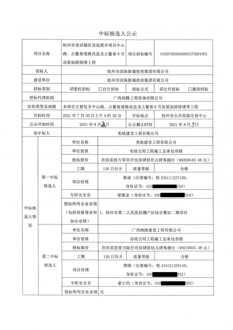 欽州市老舊城區(qū)改造提升項目中山路、占鰲巷道路改造及占鰲巷8號房屋加固修繕工程-中標候選人公示