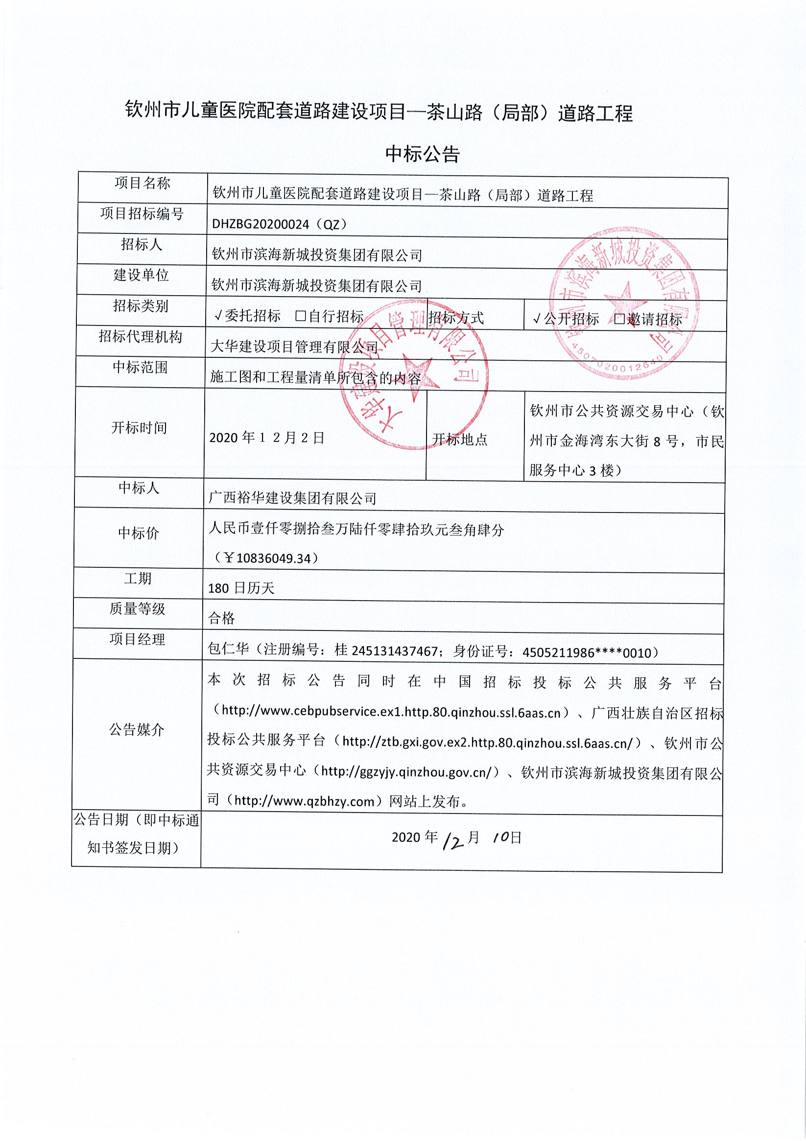 欽州市兒童醫(yī)院配套道路建設項目-茶山街(局部)道路工程中標公告