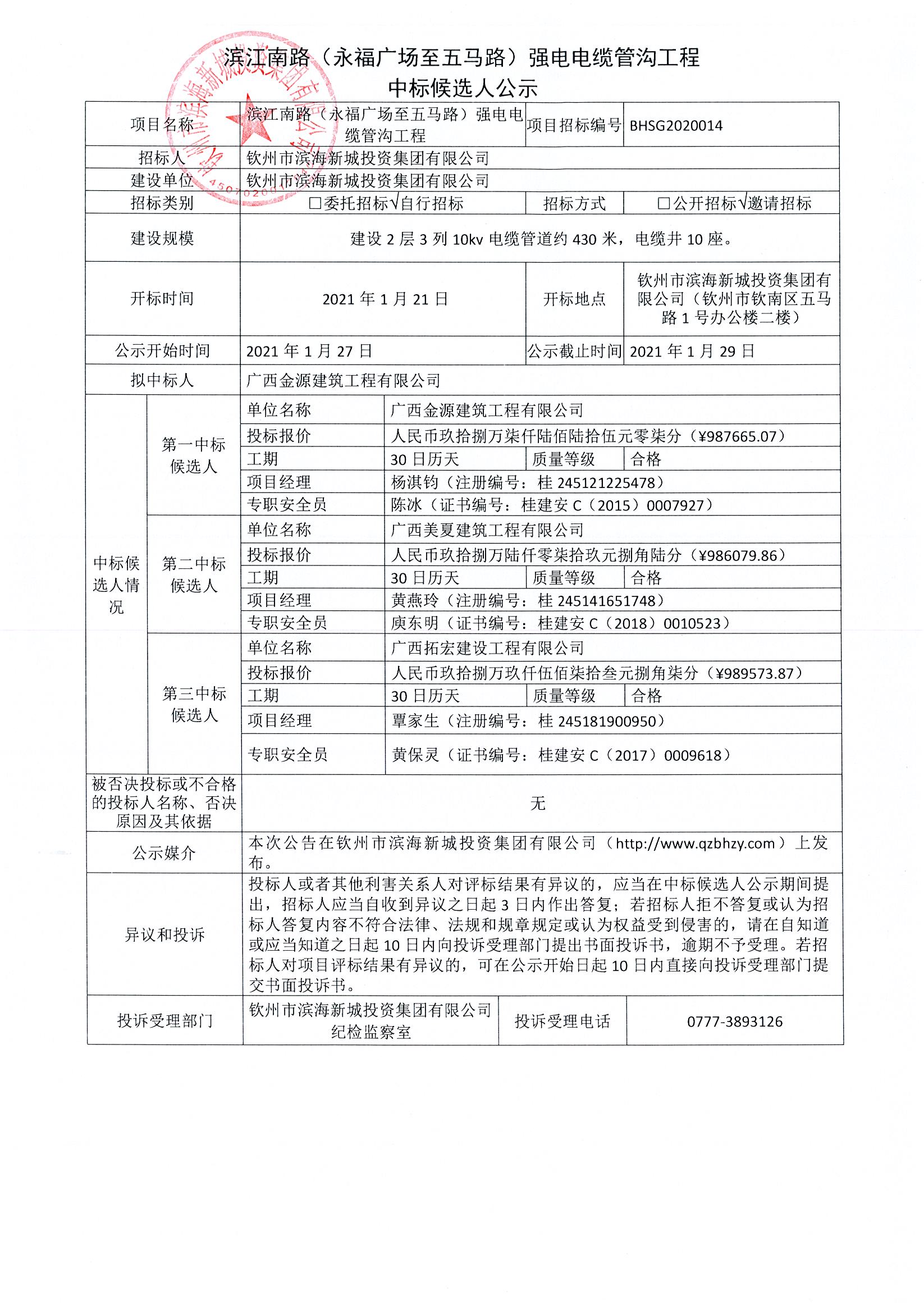 濱江南路(永福廣場至五馬路)強電電纜管溝工程中標候選人公示