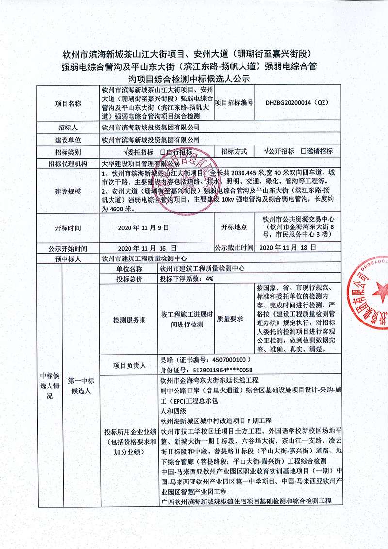 欽州市濱海新城茶山江大街項目、安州大道(珊瑚街至嘉興街段)強弱電綜合管溝及平山東大街(濱江東路-揚帆大道)強弱電綜合管溝項目綜合檢測中標候選人公示