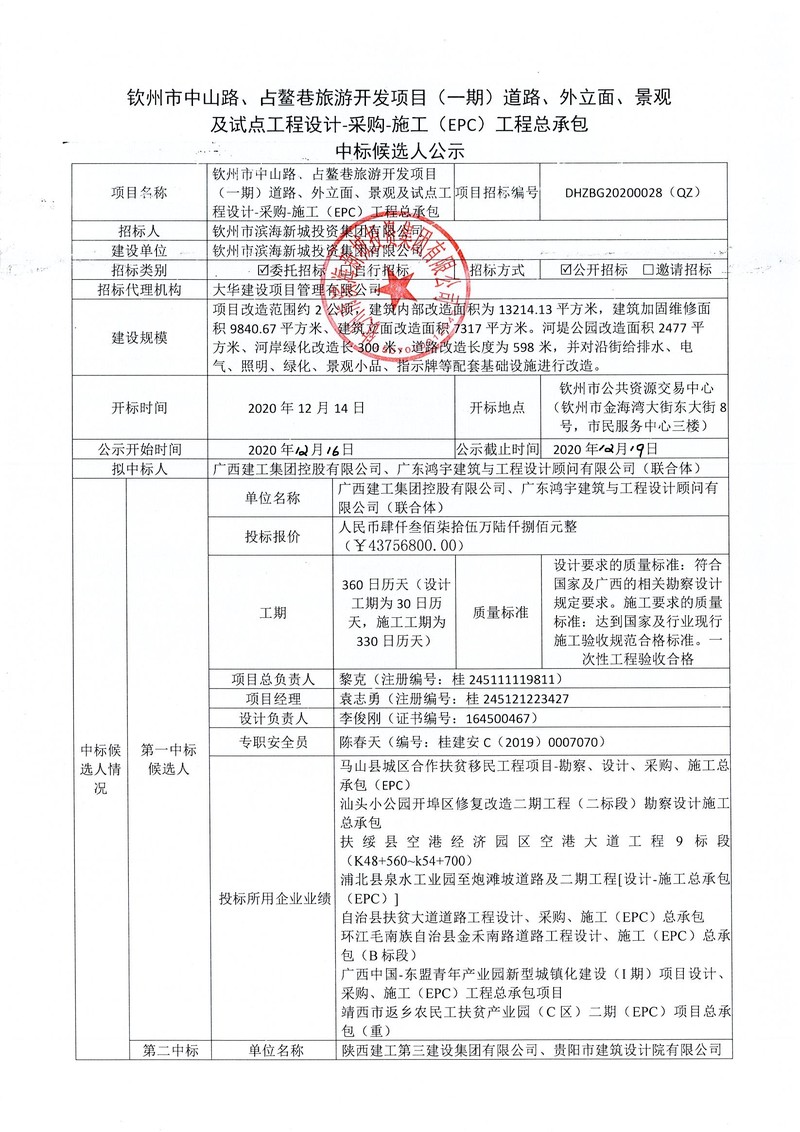 中標公示-欽州市中山路、占鰲巷旅游開發(fā)項目(一期)道路、外立面、景觀及試點工程設計-采購-施工(EPC)工程總承包中標公告