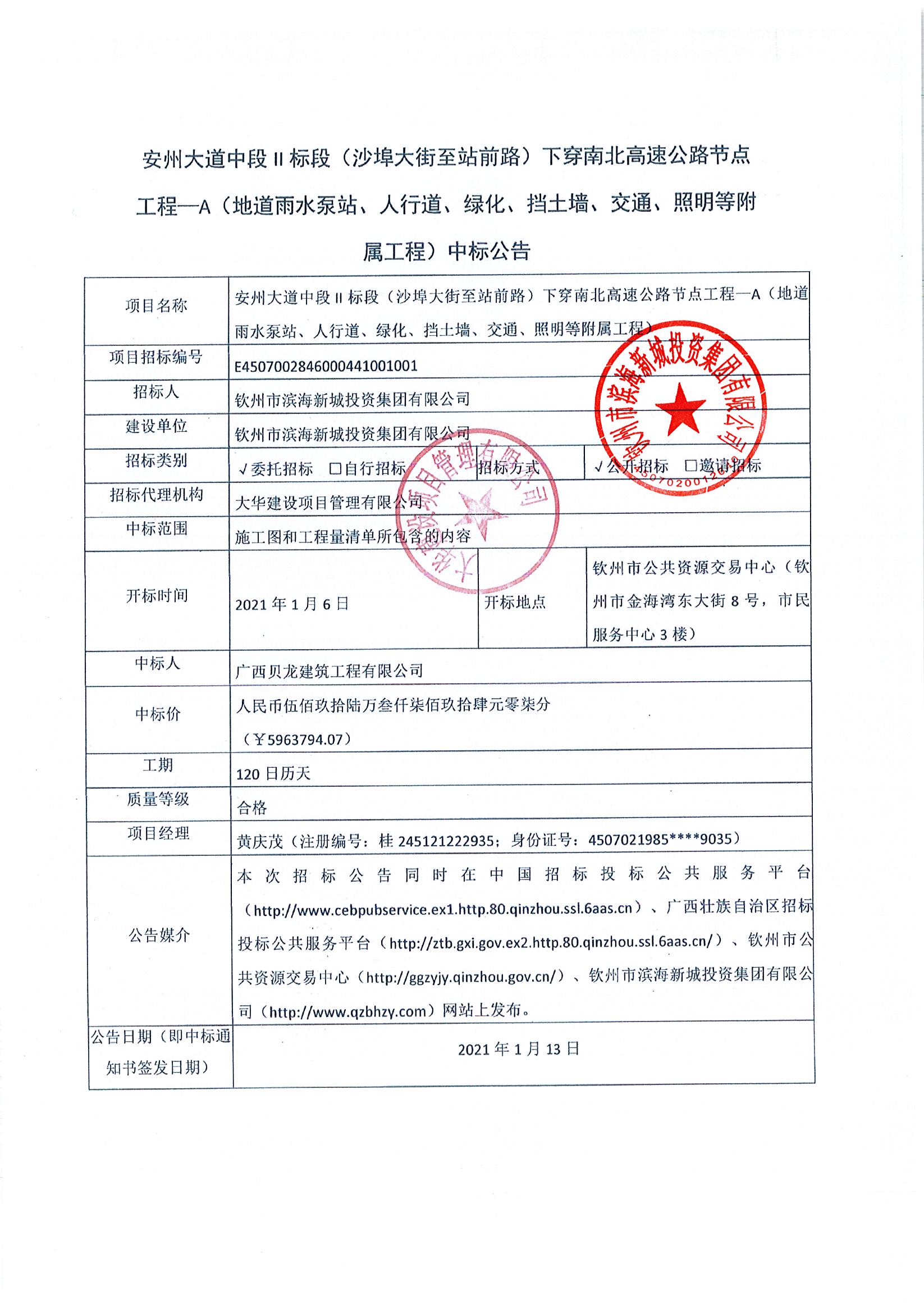 安州大道中段II標段(沙埠大街至站前路)下穿南北高速公路節(jié)點工程—A(地道雨水泵站、人行道、綠化、擋土墻、交通、照明等附屬工程)中標公告