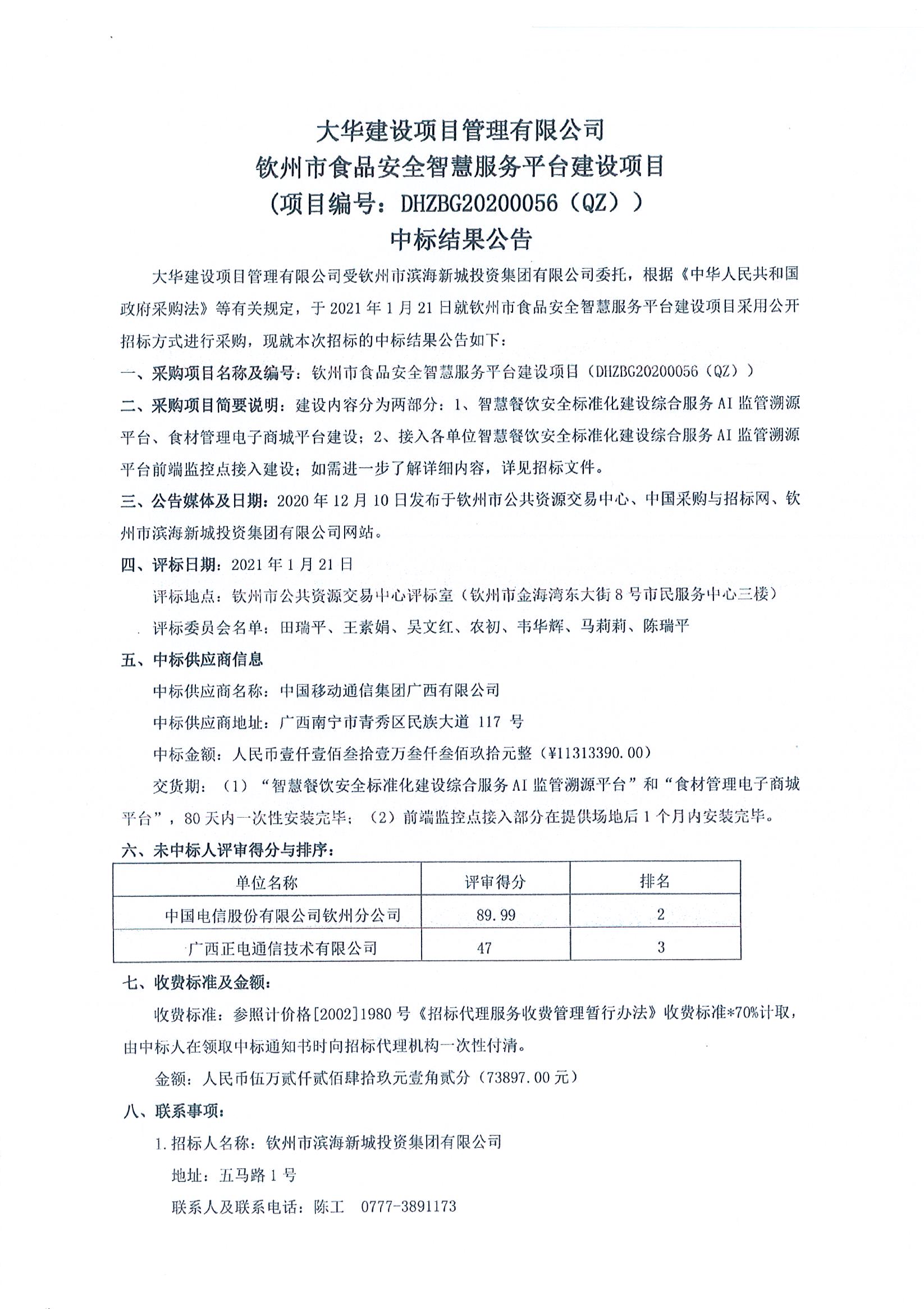 欽州市食品安全智慧服務平臺建設項目中標結果公告