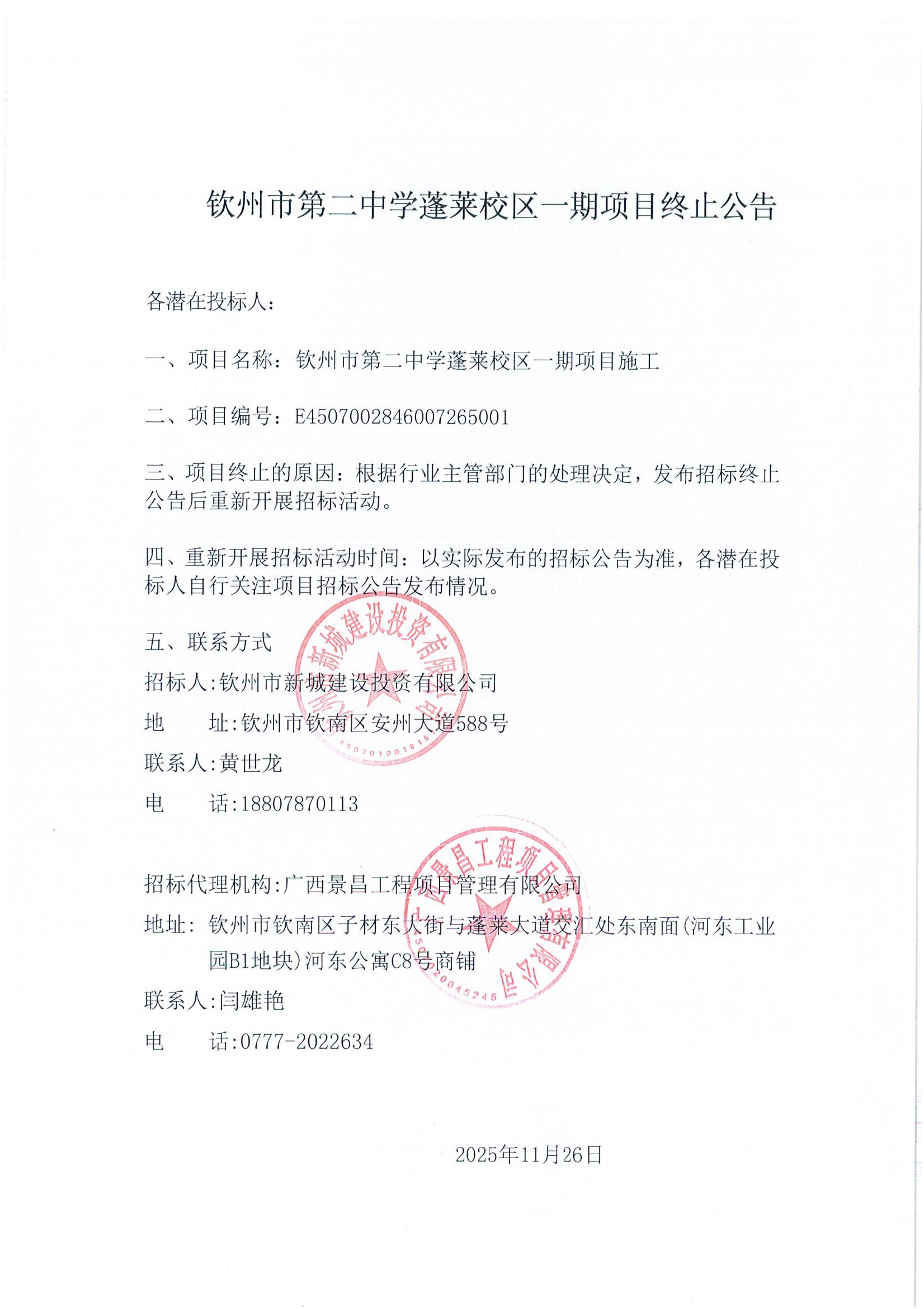 • 欽州市第二中學(xué)蓬萊校區(qū)一期項(xiàng)目終止公告