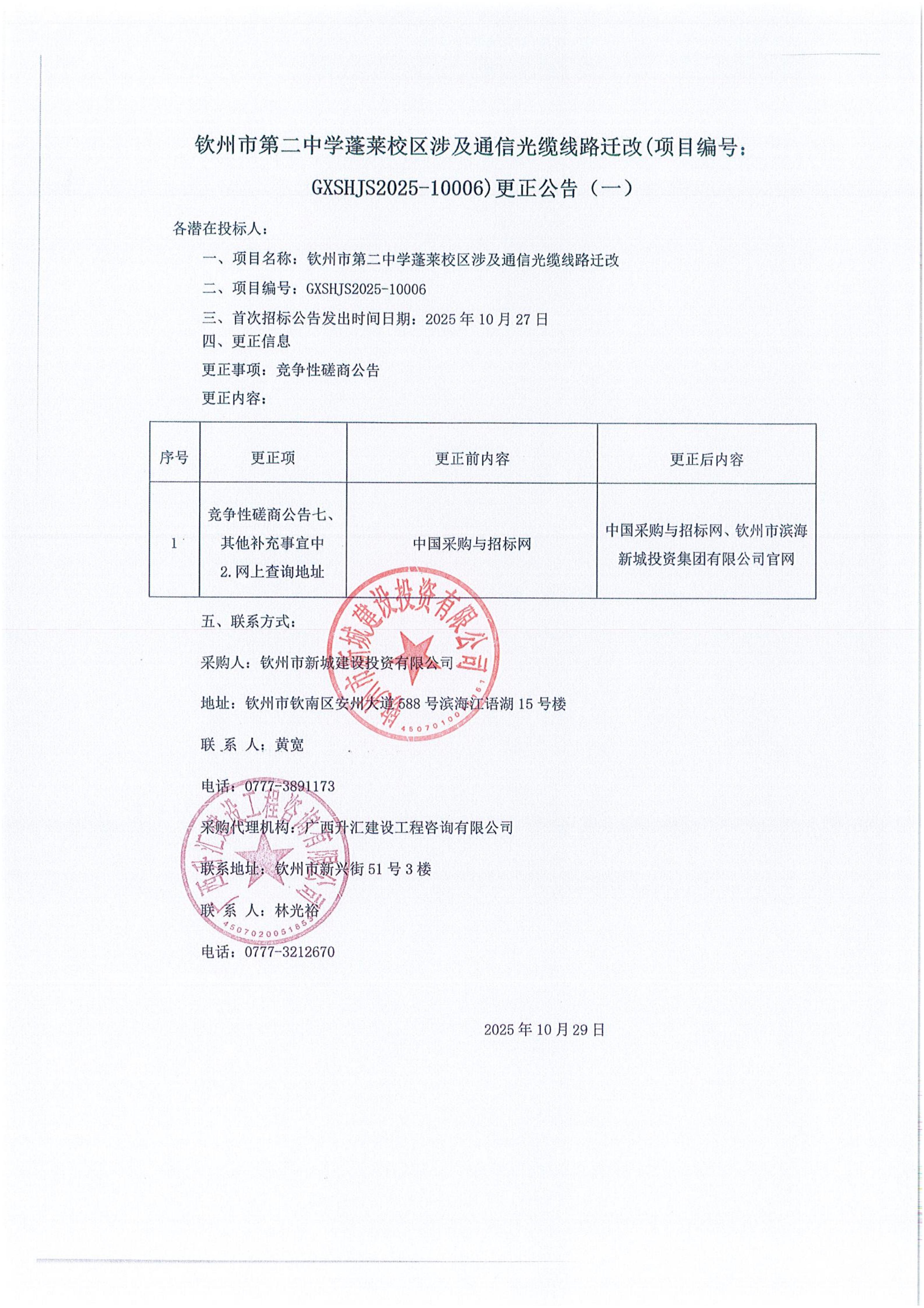 欽州市第二中學蓬萊校區(qū)涉及通信光纜線路遷改(項目編號: GXSHJS2025-10006)更正公告(一)