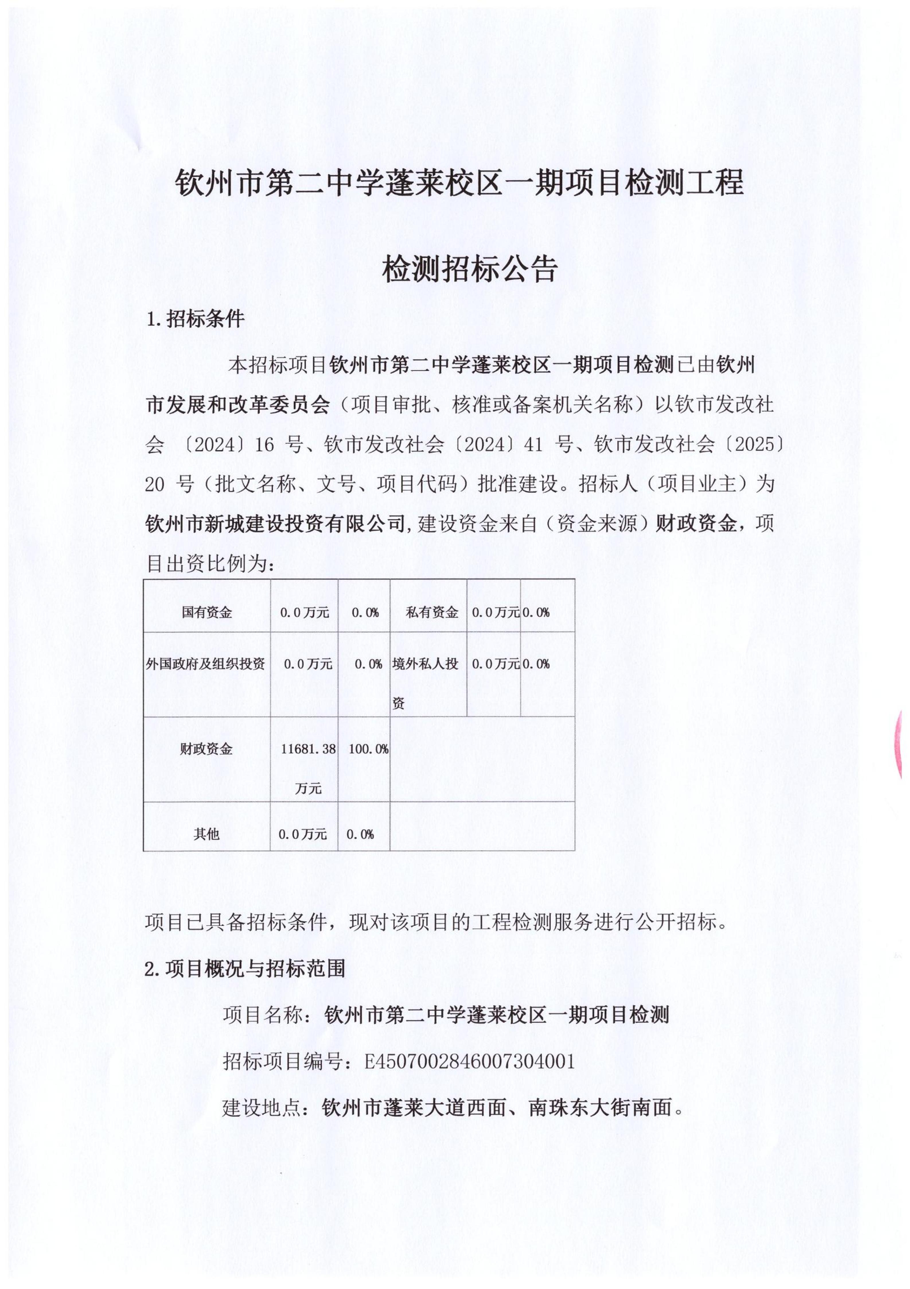 欽州市第二中學蓬萊校區(qū)一期項目檢測工程檢測招標公告