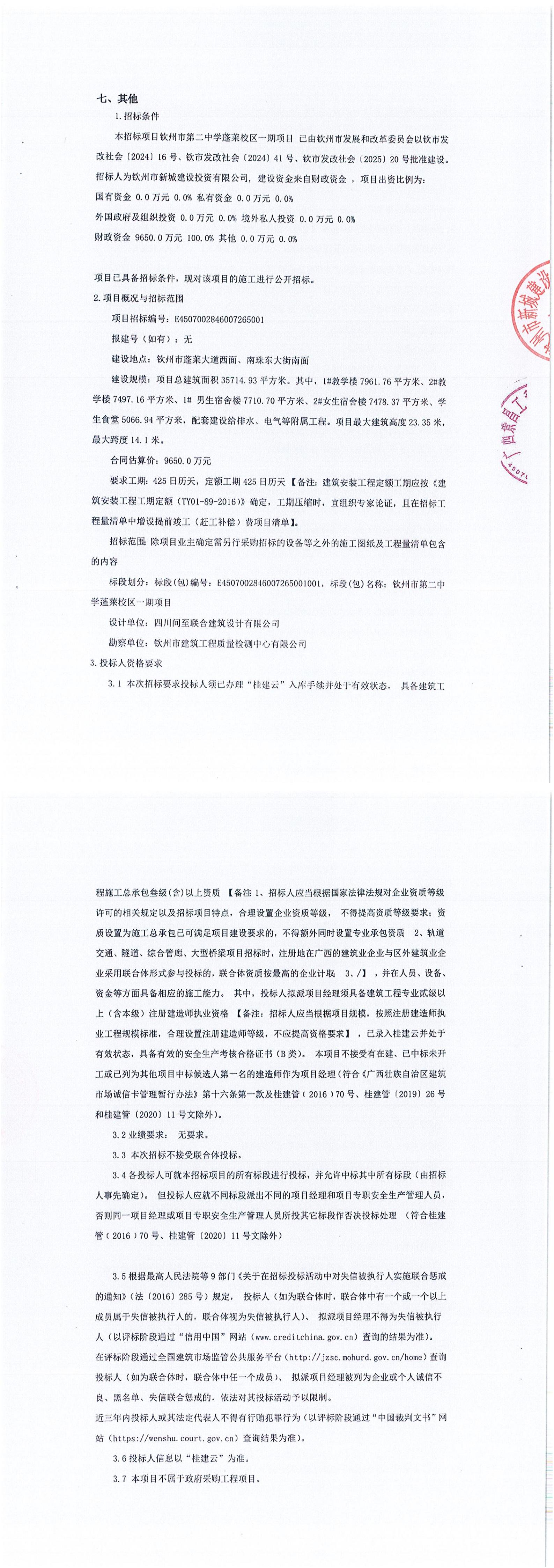 欽州市第二中學(xué)蓬萊校區(qū)一期項(xiàng)目(項(xiàng)目招標(biāo)編號(hào):E4507002846007265001)更正公告(一)