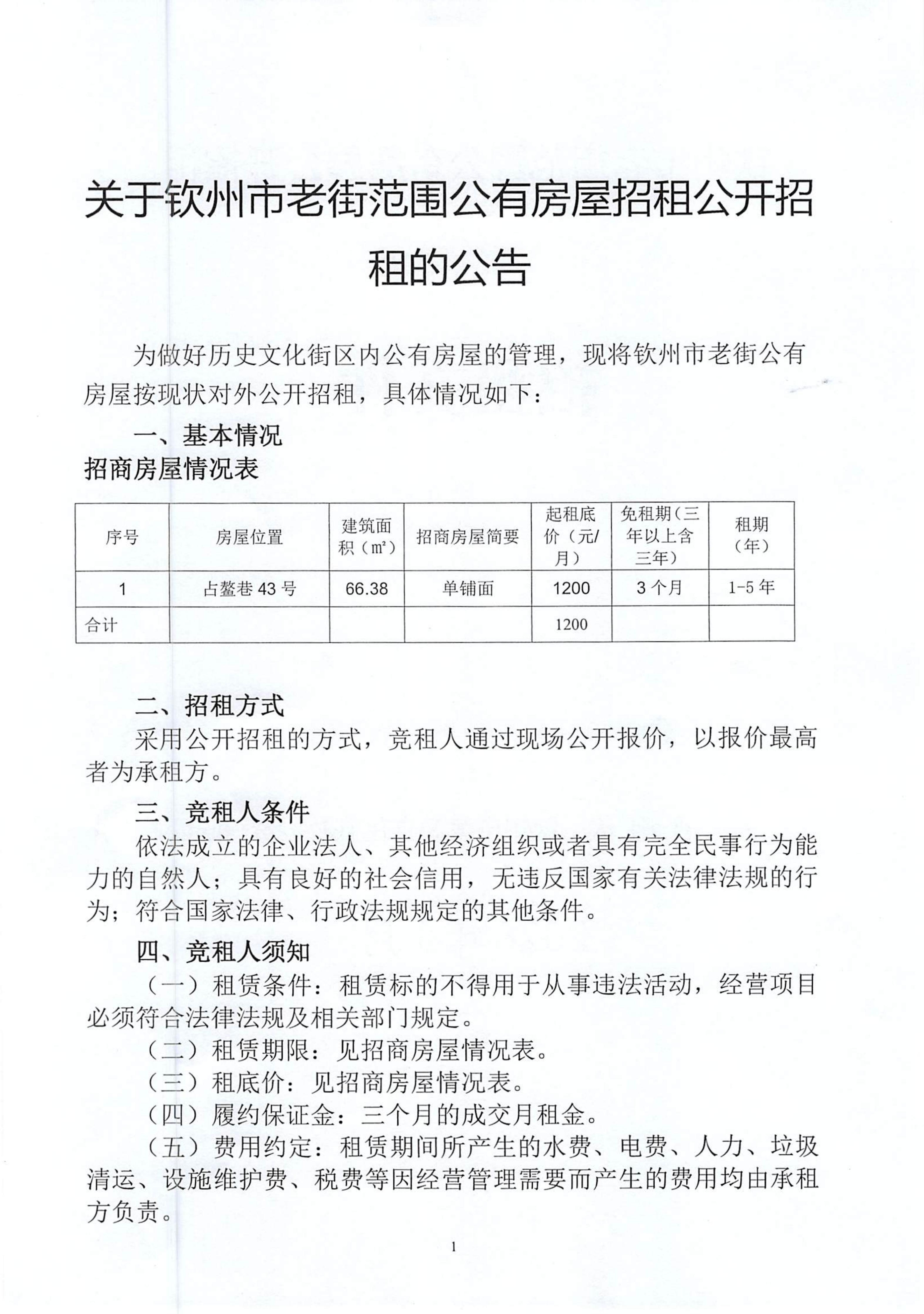 關(guān)于欽州市老街范圍公有房屋招租公開招租的公告